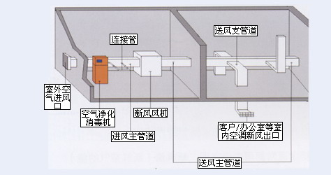 (1) 壁挂机和立柜机自带的内循环风装置,可带动消毒空间内的空气分子做有效流动,促使消毒机产生的臭氧在空间内均匀分布;其中壁挂机带遥控器控制,在目标空间内距地2.5米处平均分布安装;立柜机的消毒控制方式更具人性化,能自由设定消毒时间和循环工作时间,实现设备安全 运行可实现无人职守,该系列机型可以适应大部分的场所(场内)独立开机消毒使用。 (2) 在具有安装中央空调循环风过滤系统(HVAC)的场所,也可以借助循环风系统的风力和送风管道,把臭氧均匀的配送到各个目标待消毒的空间,安装方法是把臭氧投加到管道系统的新风风机的前端,靠风机强大的风力带动把臭氧吸如循环风管内,用于该系统的消毒机要求臭氧能管道输送添加,我公司的OZ系列和SOZ系列产品可以满足该需求,可以实现集中式自动控制,以下 图示是消毒机的三种安装方法,供参考。 (3) 通过在待消毒空间内均匀布管(PVC管或硅胶管),在管网中安装多处臭氧投加输出口,出口处加装阀门以控制臭氧输出量,臭氧靠消毒机的输出压力压入管网内达到均匀输出,也可以实现消毒系统集中自动控制和管理。